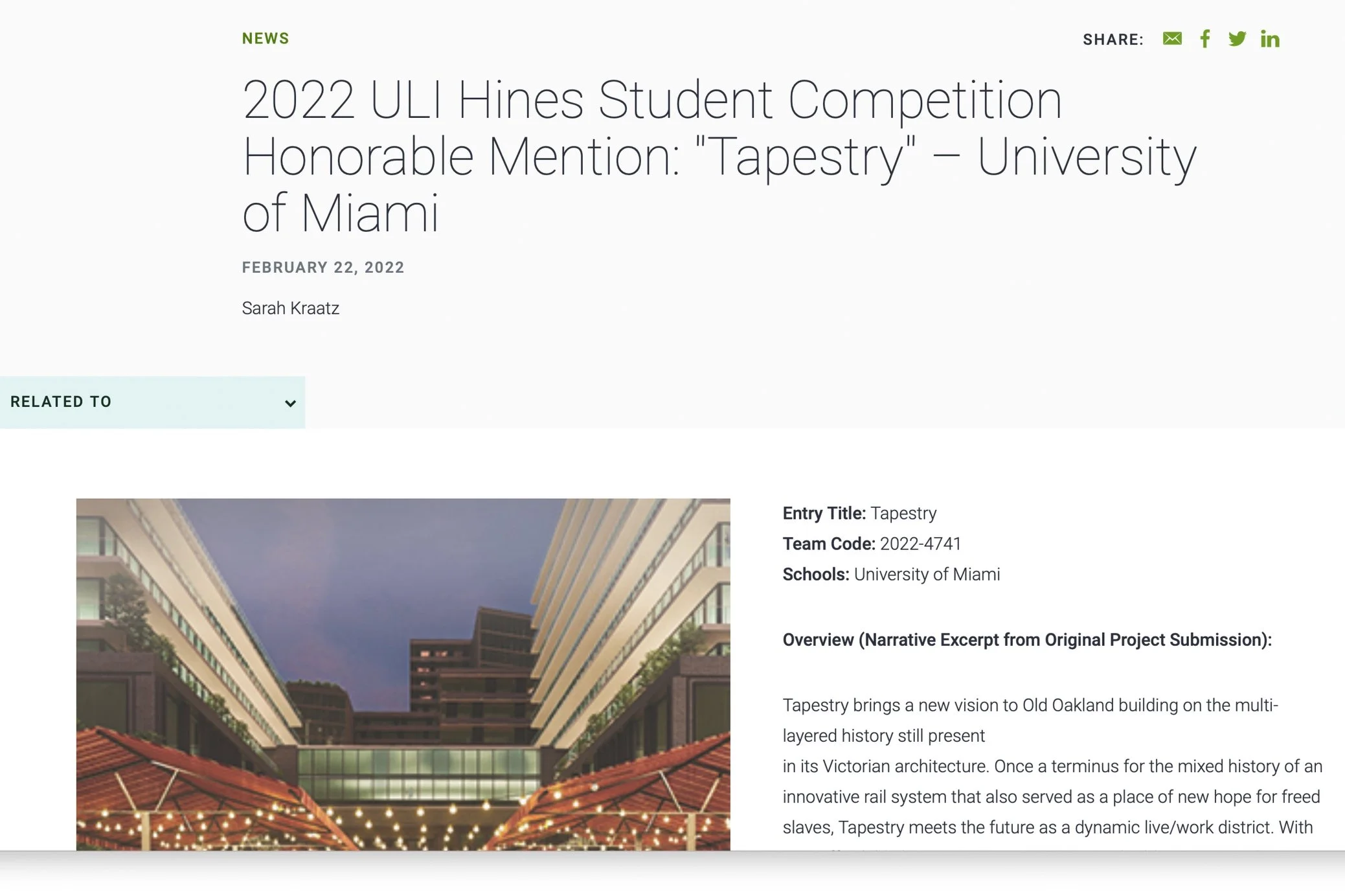 Nationwide honorable mention in the ULI Hines Competition for “tapestry” an urban design development located in Oakland, California.