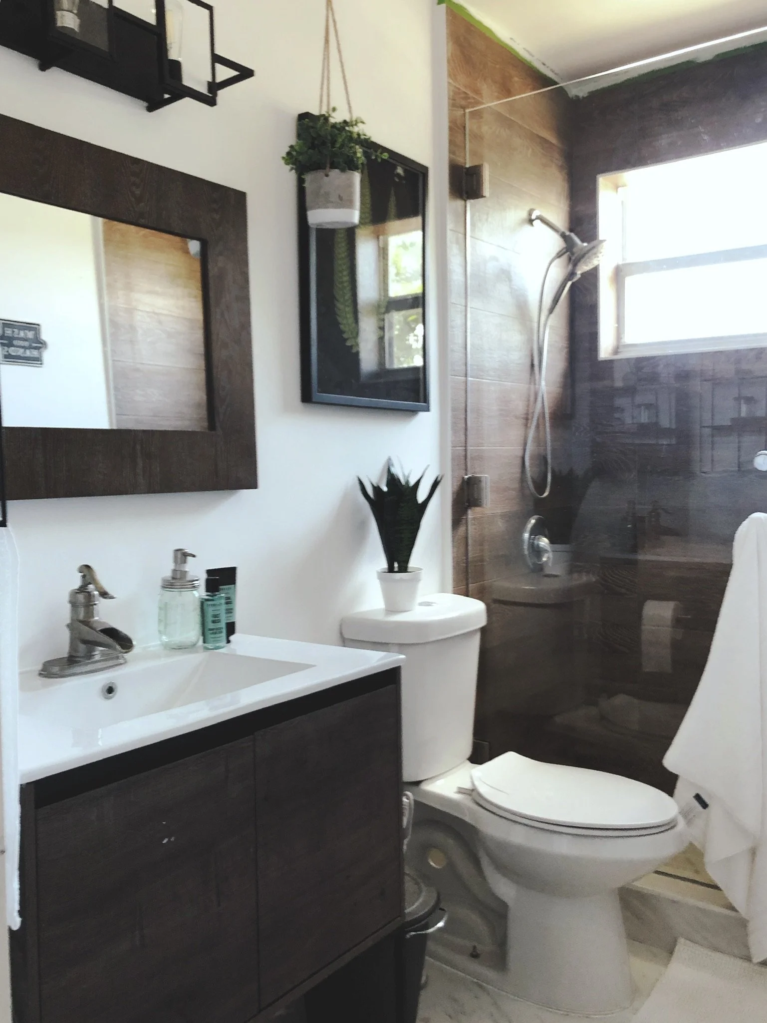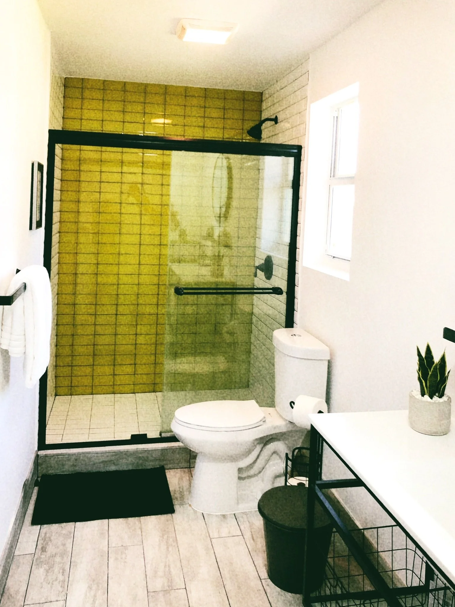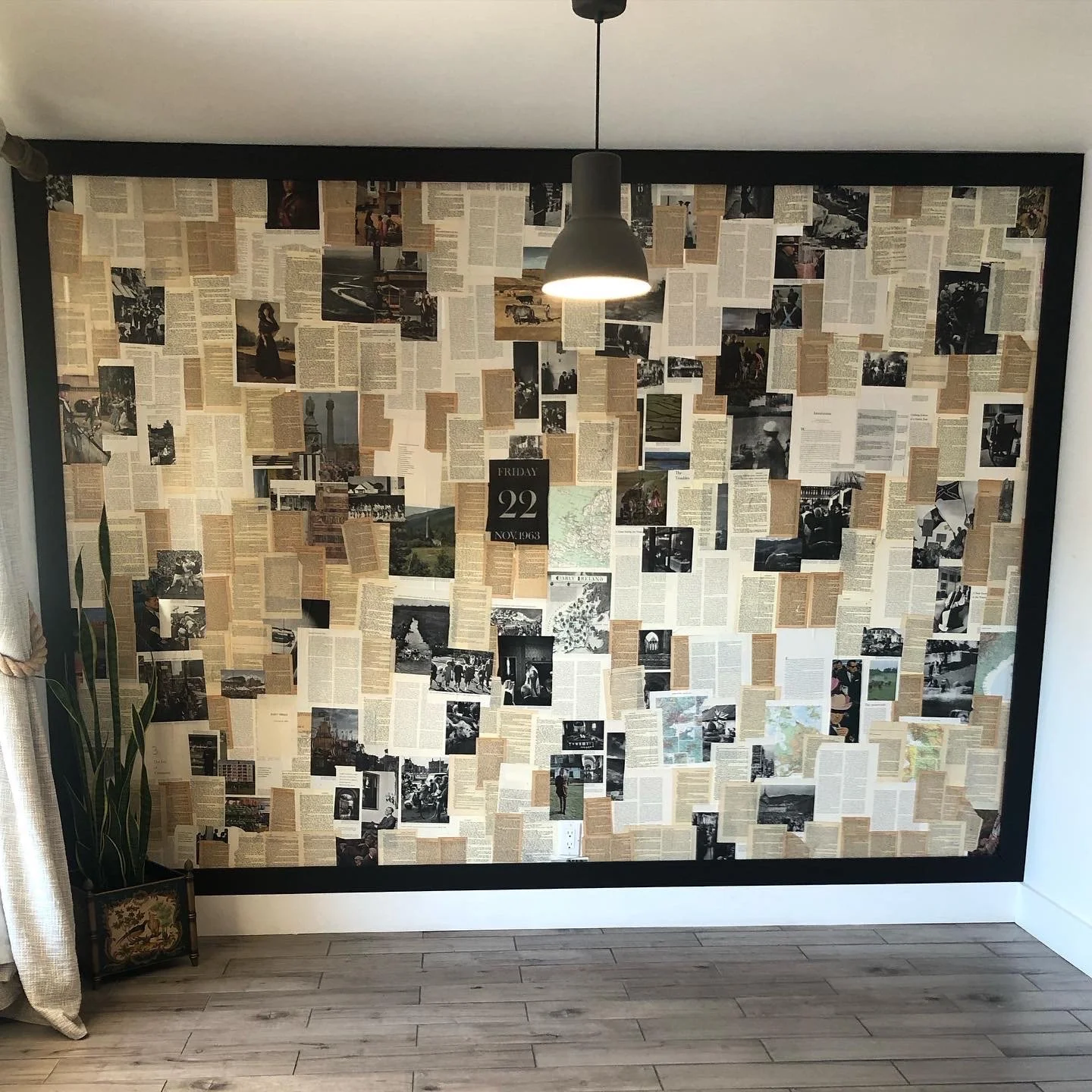A single family dwelling was transformed from an un-updated 1970’s home into a charming airbnb in a twist of modern and vintage. Handmade wallpaper accent wall seen here using pages curated from antique magazines and books with painted black frame.